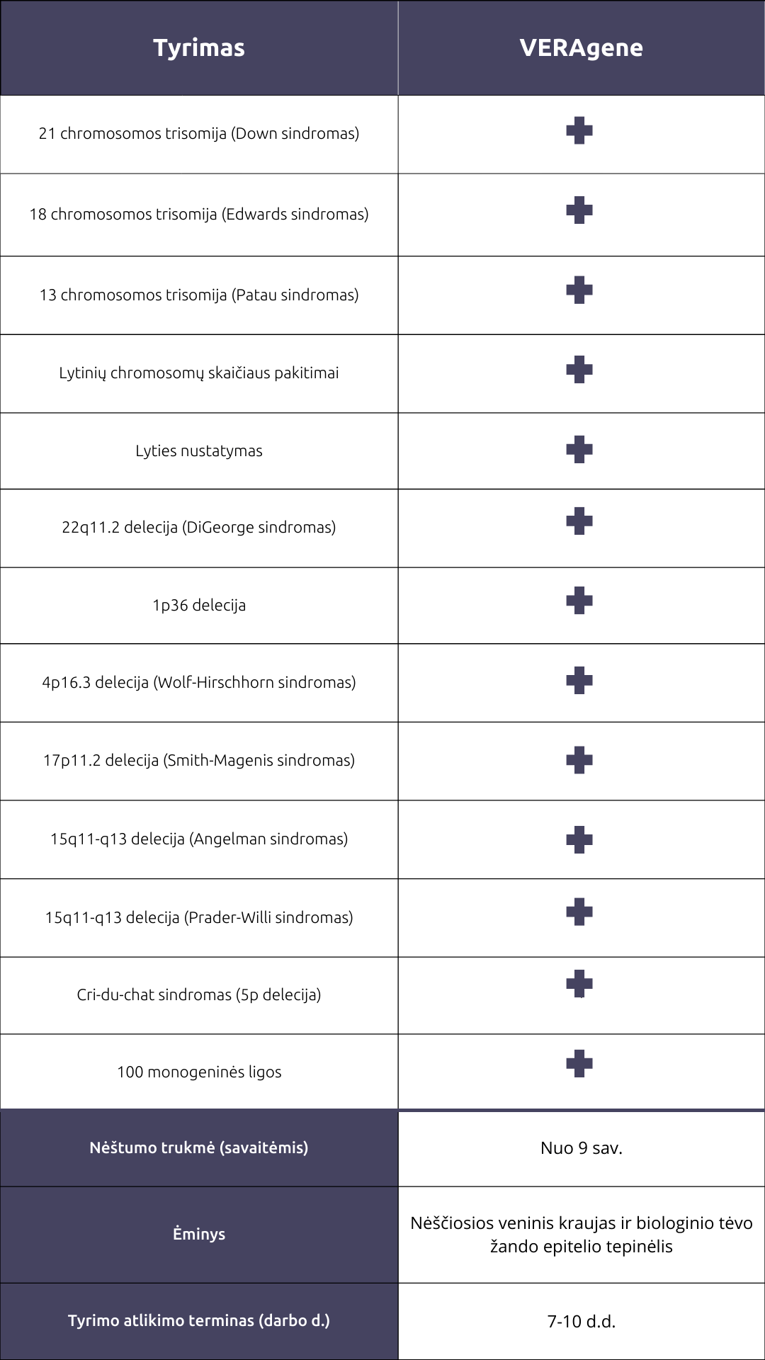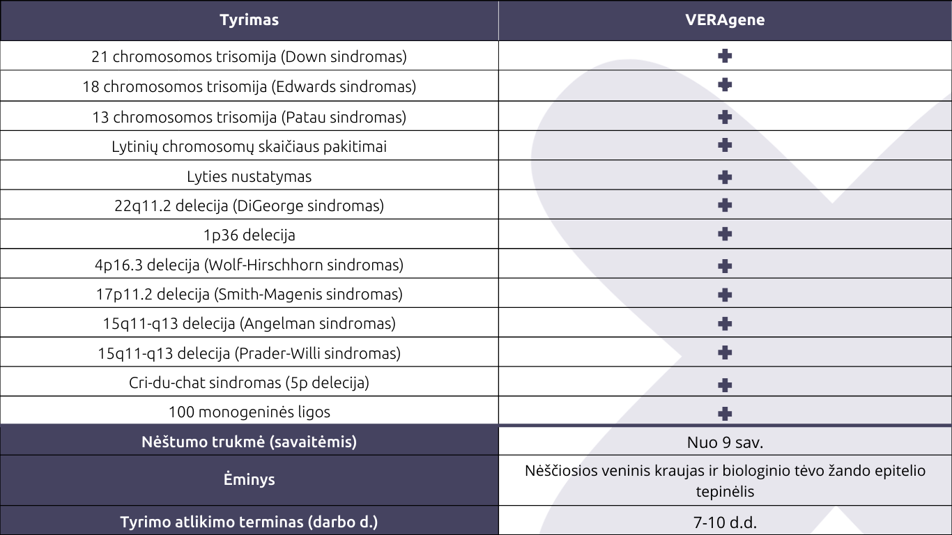 tai pirmasis išsamus prenatalinis atrankinis tyrimas (NIPT), skirtas dažniausiai pasitaikantiems genetiniams pakitimams nustatyti. „VERAgene“ pagrįstas patentuota technologija, kuri buvo sukurta siekiant išvengti sudėtingų ir neinformatyvių genomo sričių ir sutelkti dėmesį tik į kliniškai reikšmingas genomo sritis. Tyrimas leidžia įvertinti Dauno, Edvardso ir Patau sindromų riziką, nustatyti lytinių chromosomų skaičiaus anomalijas, mikrodelecijas bei apskaičiuoti vaisiaus riziką susirgti net 100 monogeninių ligų.